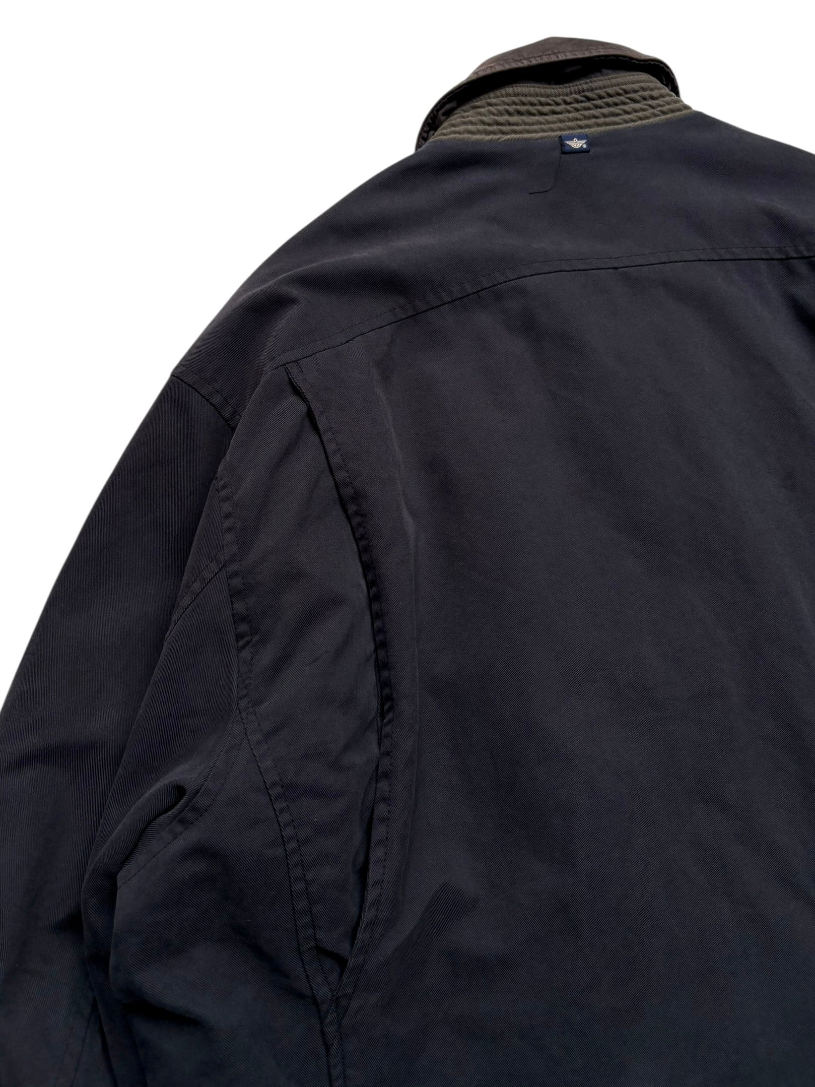 シンプルなブラック単色で襟レザー。