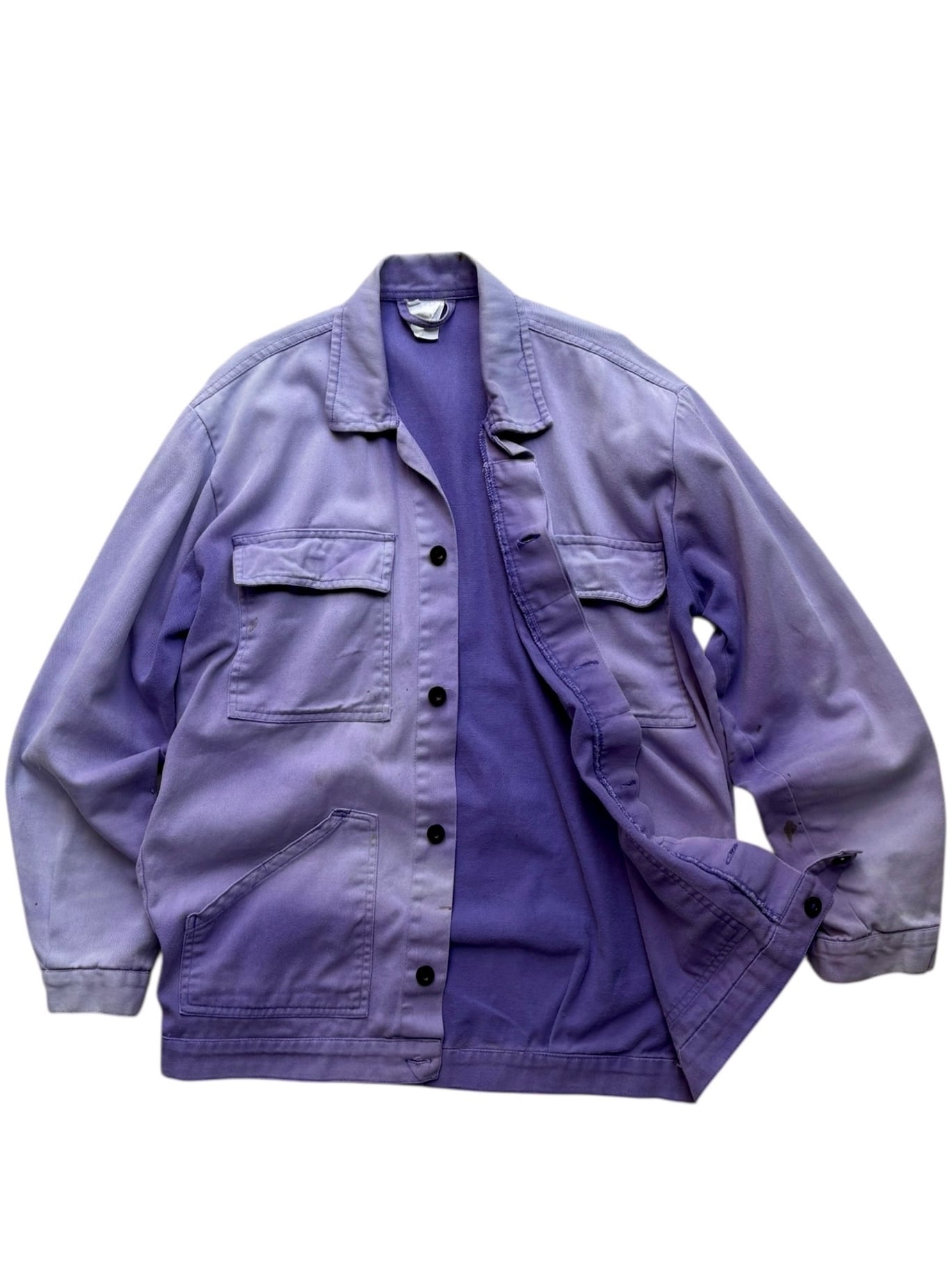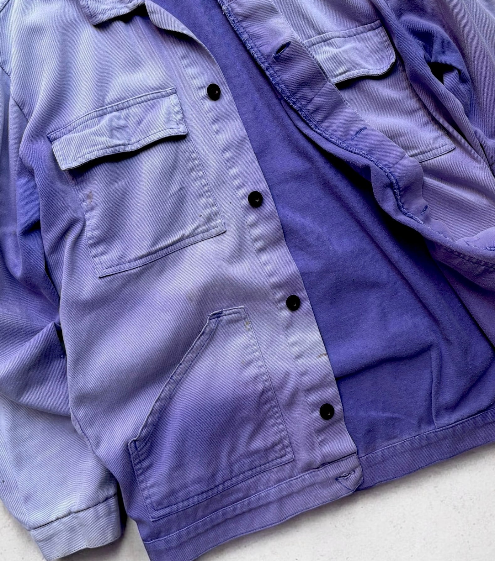 激しい色落ちにより限りなく白に近づいた肩周りから、裾の茄子紺に向けて綺麗なグラデーションに仕上がった極上品◎