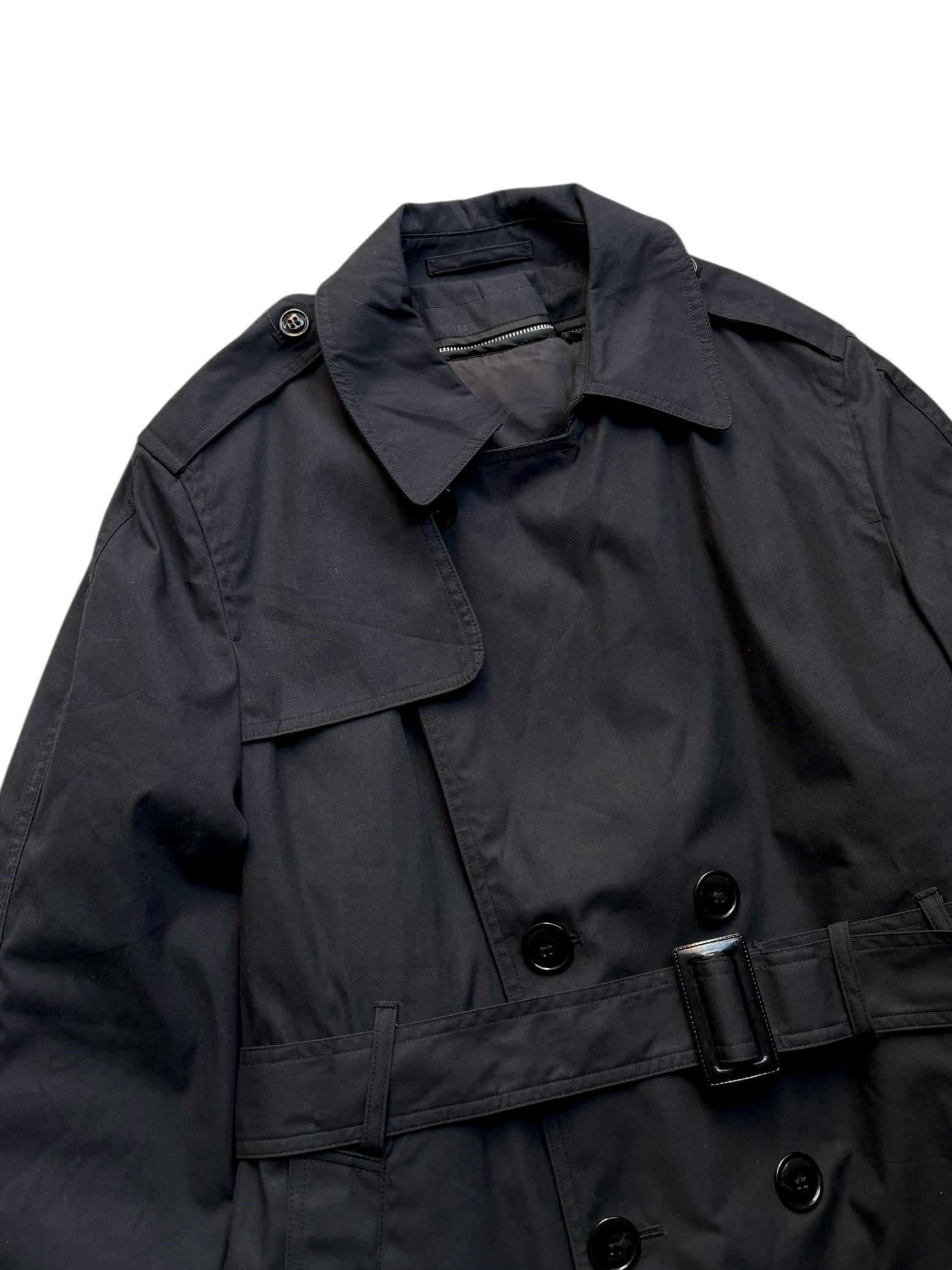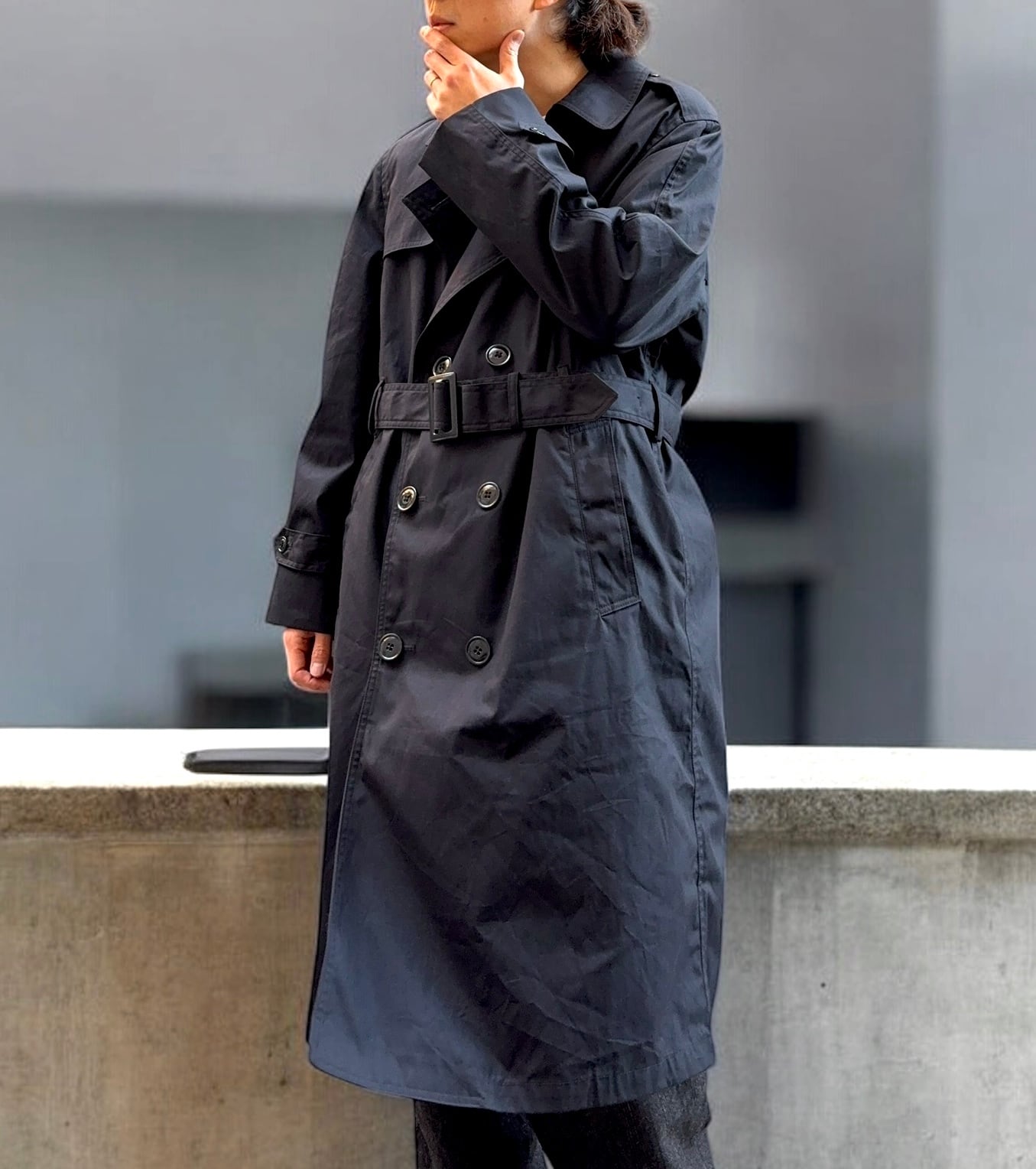 汎用性の高いシンプルなブラックのトレンチコート。