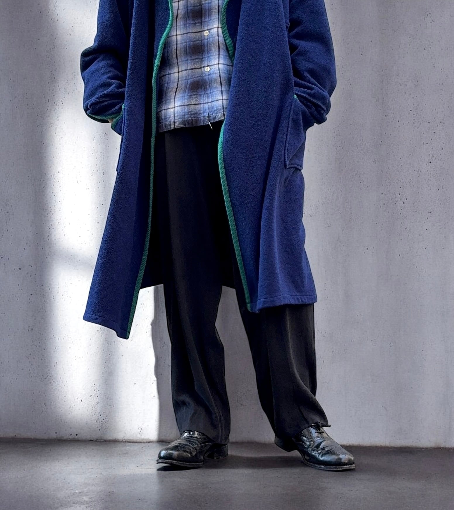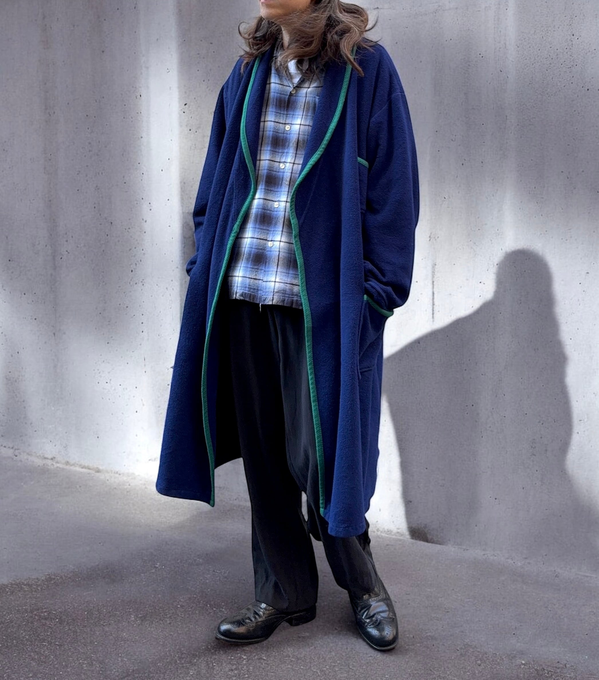 保温性のあるフリース生地を使用したガウンコート。