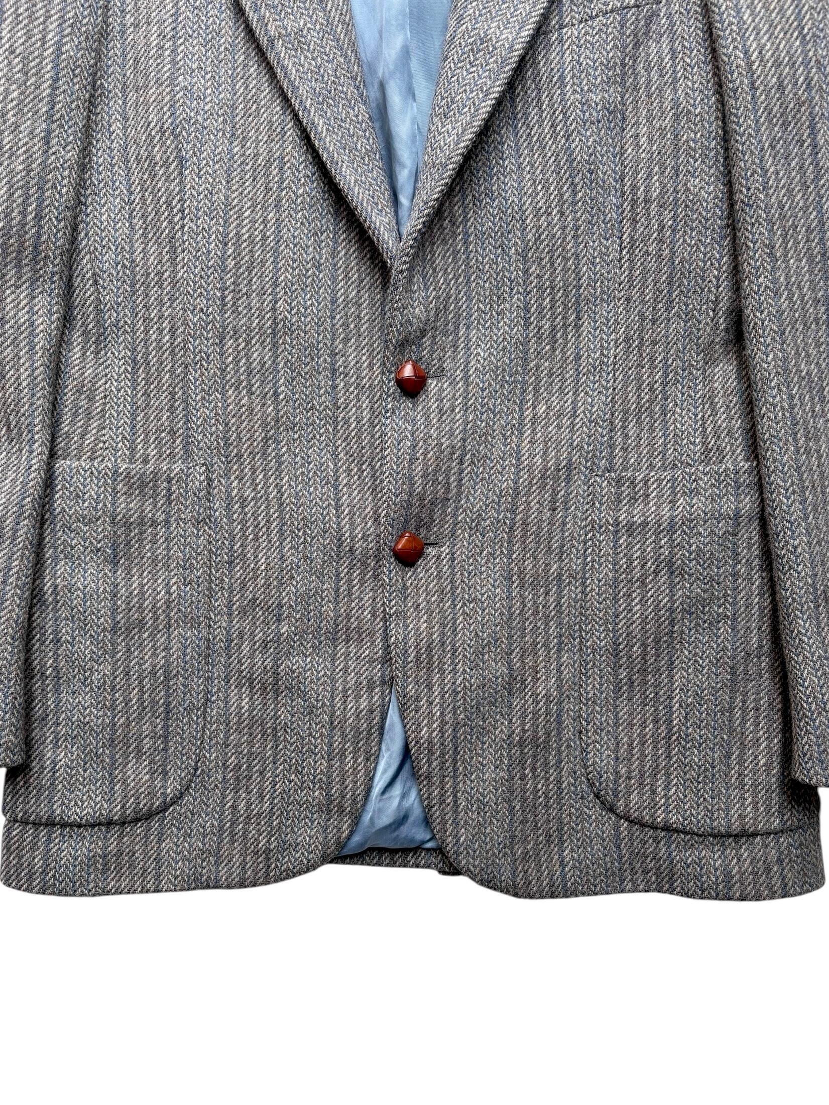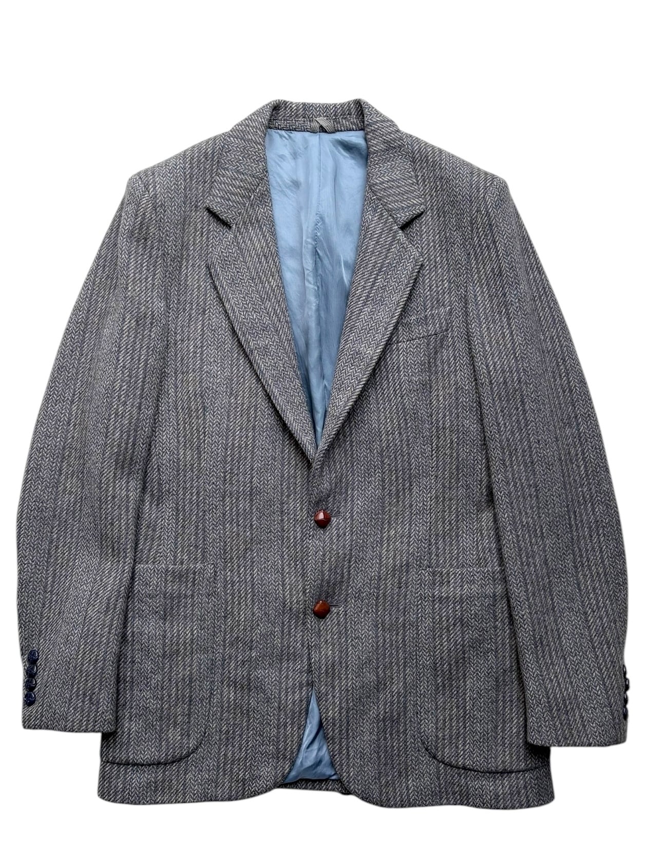 袖部分はブルーのくるみボタン、フロントはブラウンのくるみボタンが使用されています。