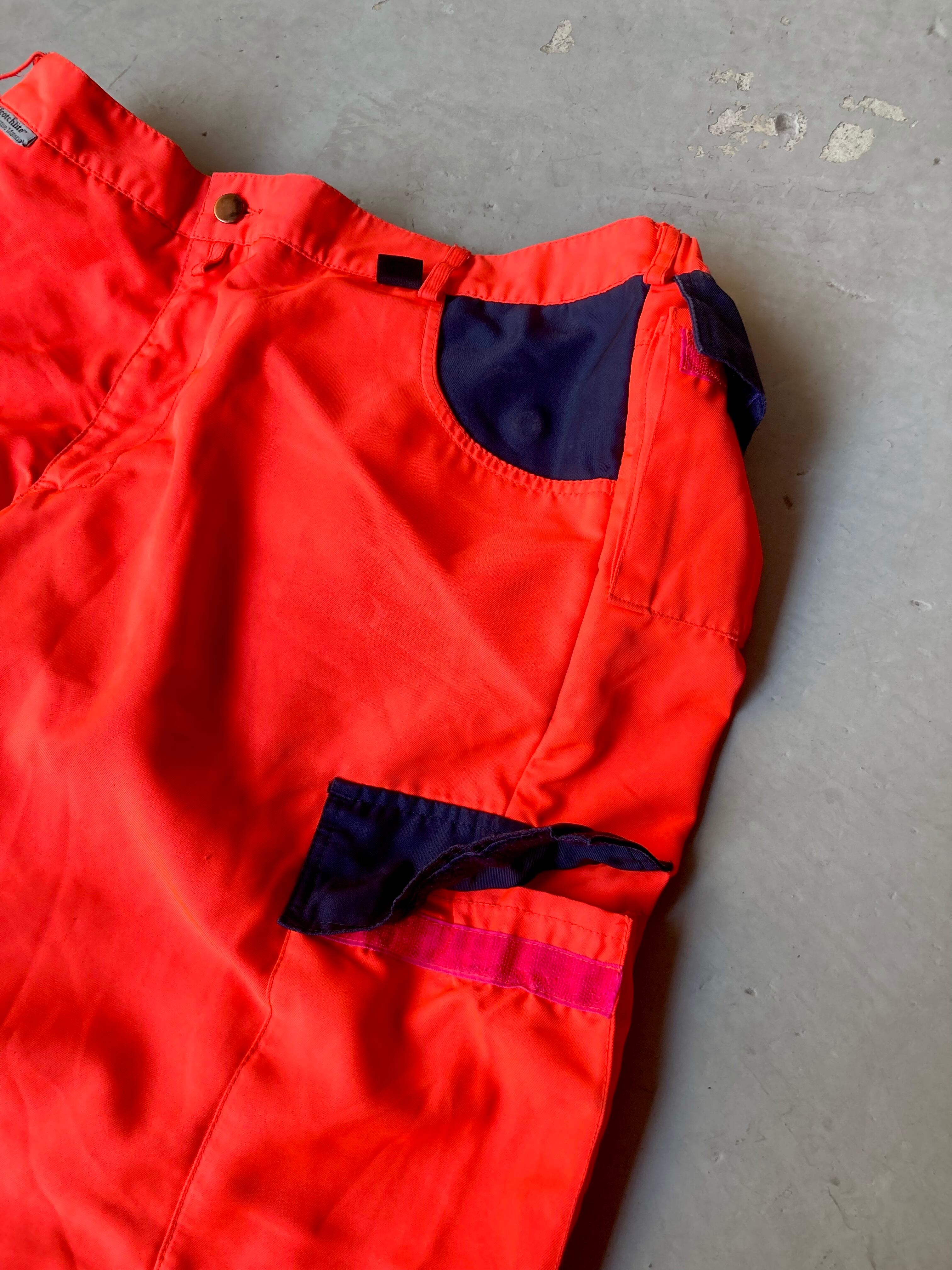 ビビットなオレンジカラーに視認性UPなリフレクターが貼られたパンツ。
