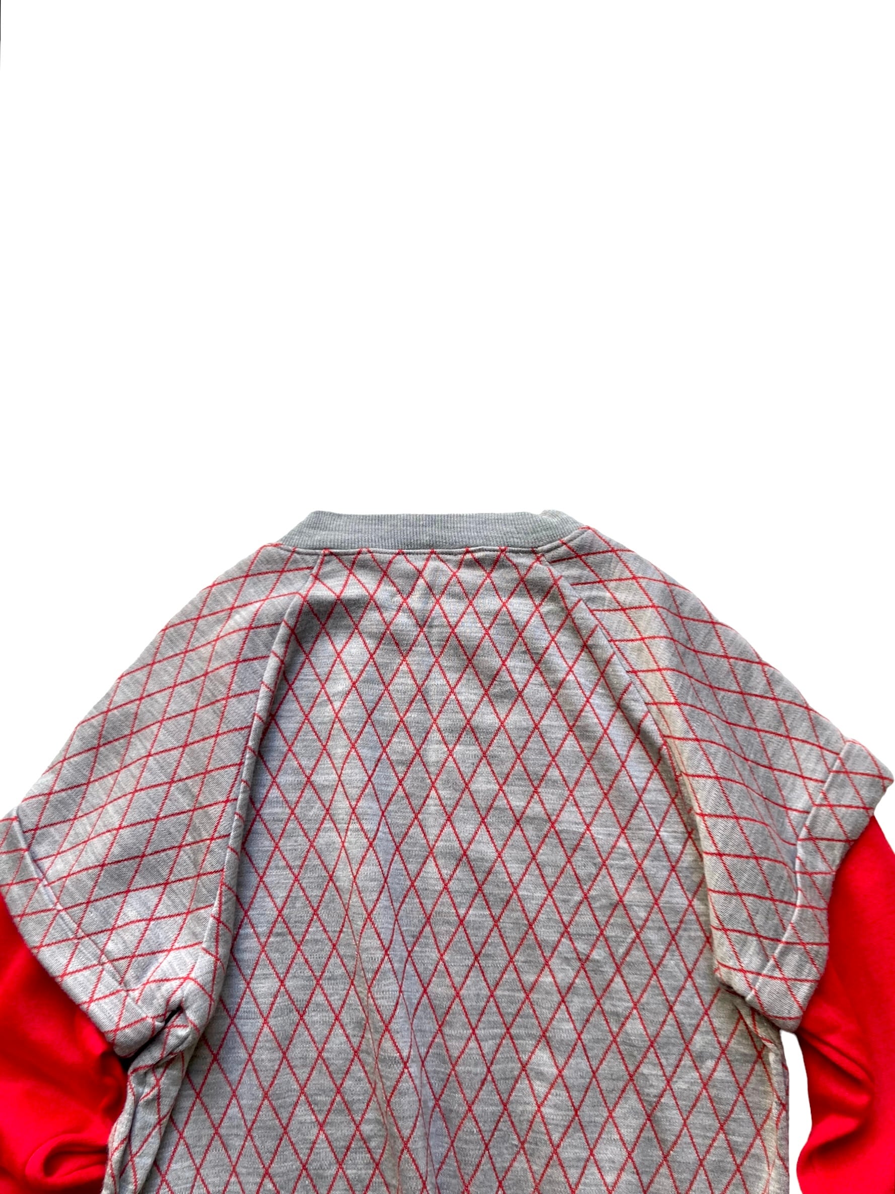 グレーに赤いダイヤ柄とレイヤードしたスリーブの色使いが可愛い1着です◎